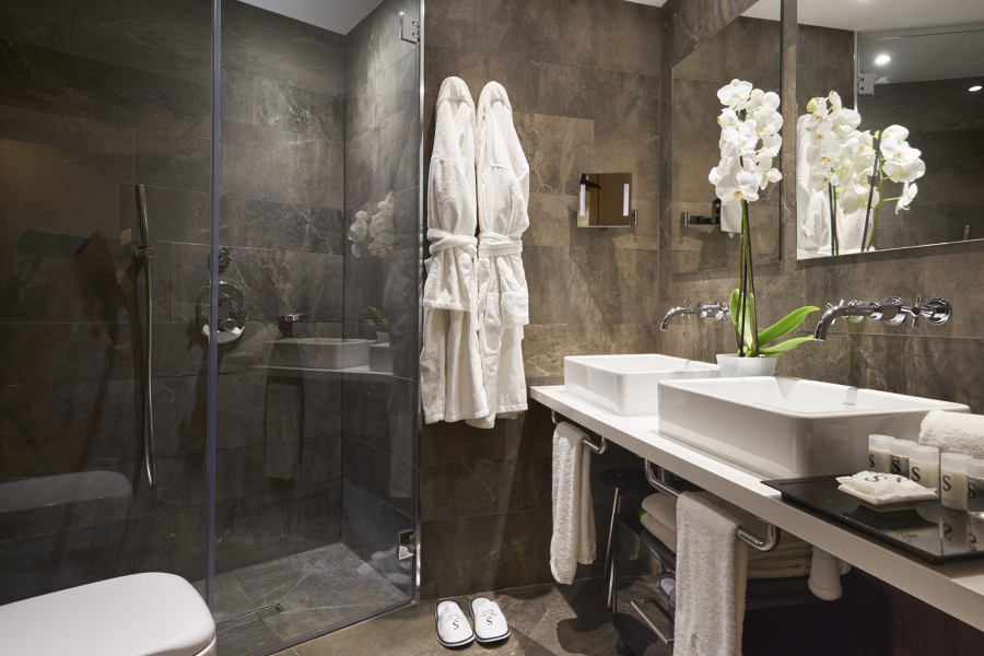 Ausstattung der Zimmer: Terrasse, Parkettboden, Minibar, Safe, WLAN, 40“ Flachbild-Fernseher, Haartrockner, Bademantel und Arbeitsbereich.
