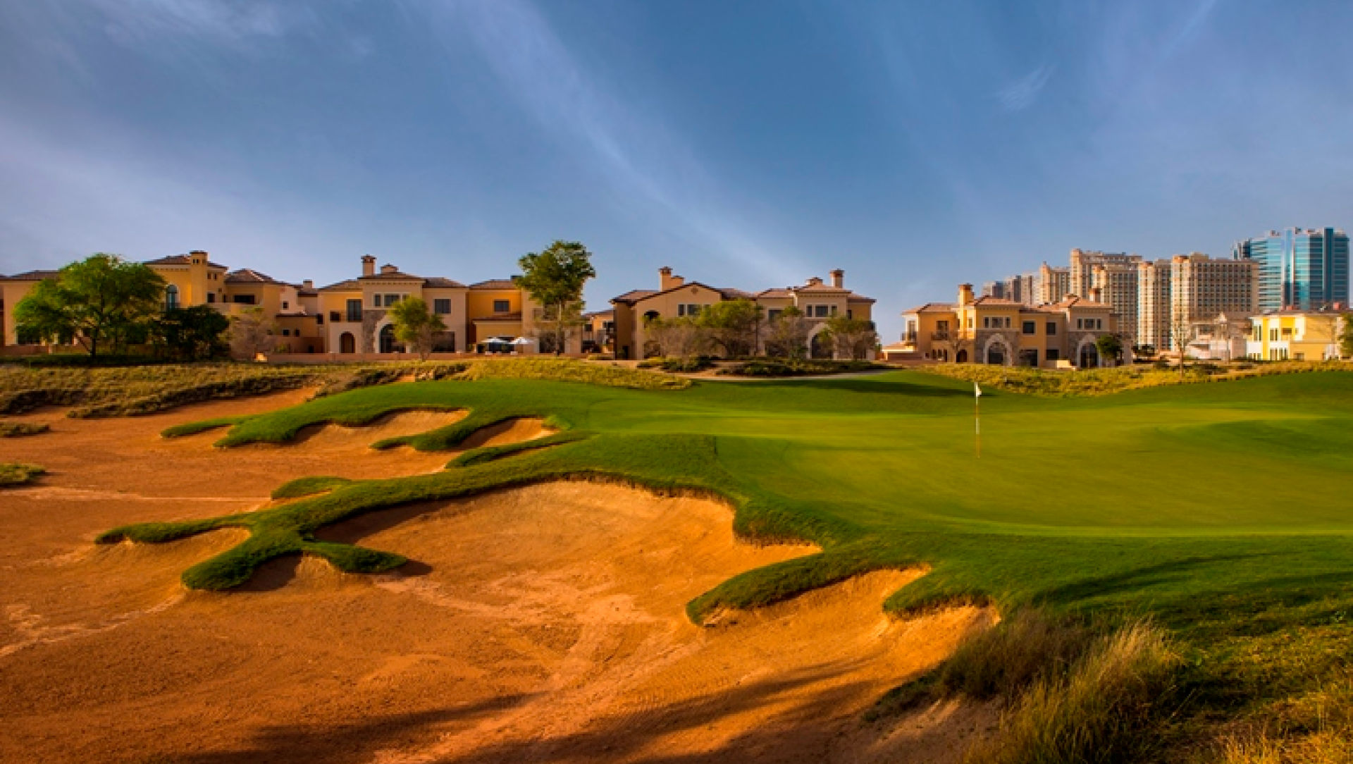Der 18-Loch Golfplatz Jumeirah Golf Estates Fire Course macht mit seinen roten Bunkern und dem schnellen Spiel seinem Namen alle Ehre.